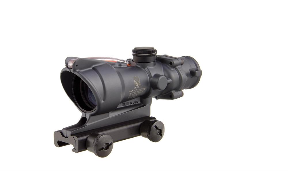 The 4x32 ACOG scope provides a dual-illuminated reticle using fiber optics and tritium for a bright aiming point in any light condition. The ranging reticle allows for bullet drop compensation out to 600 meters without any manual adjustments.